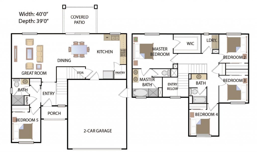 This 1,950 square foot two story home features 5 bedrooms, 3 full bathrooms, and an open concept living area. Downstairs you will find the living area which includes a great room, dining area, and kitchen. The kitchen features a walk in corner pantry with an option for an additional pantry space. Also downstairs you will find bedroom 5 and a full bathroom with a walk in shower. Head upstairs to find the remaining bedrooms including the primary bedroom suite. The primary bedroom suite features dual vanities, bathtub, walk in closet, and separate toilet area. There is also an option for the primary bathroom that would include a soaking tub and walk in shower. The laundry room sits between the master suite and bedroom 2. There is another full bathroom centrally located among bedrooms 2,3, and 4. Bedroom 4 has the option to be a game room. The garage has space for 2 cars with a 3-car option. As with any G.J. Gardner Home, we can customize this plan to suit your lifestyle. Contact one of our Design Centers today!